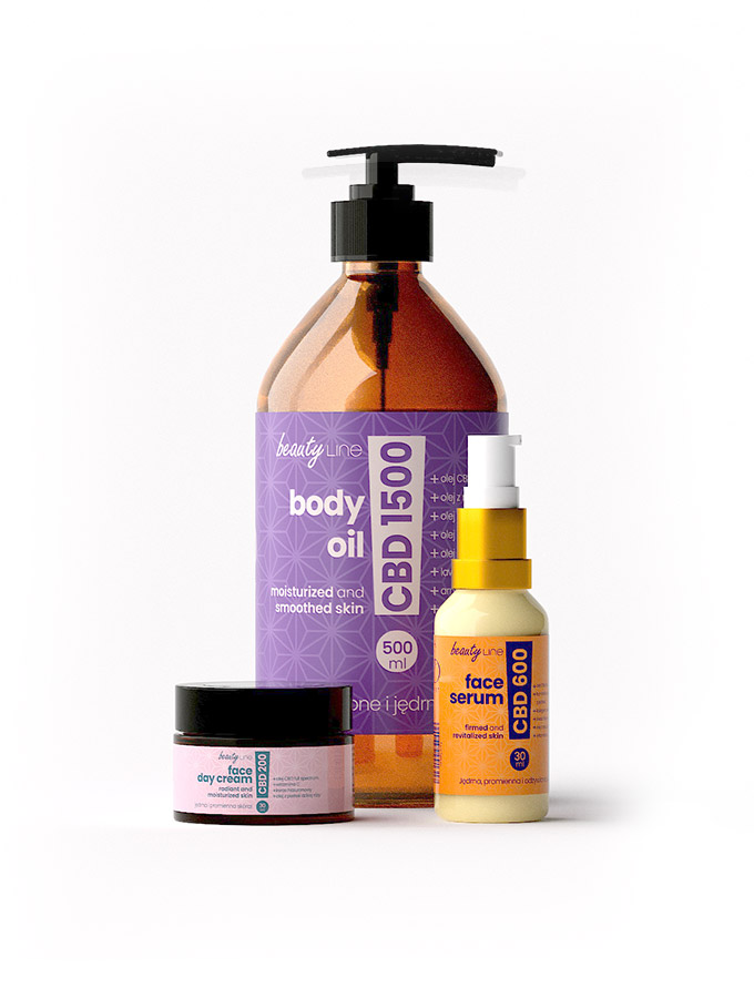 Special set – GLEAM&GLOW BODY | CBD Skin Expert is a sensational care set! It will be an exceptional support for your skin before the summer season. Day cream with wild rose oil, due to its light formula, will be perfect under summer make-up, serum with hyaluronic acid and prickly pear oil will moisturize and regenerate your skin after sun exposure, and wonderfully nourishing and firming olive with gold particles will illuminate the body and nourish, giving the skin its natural glow!